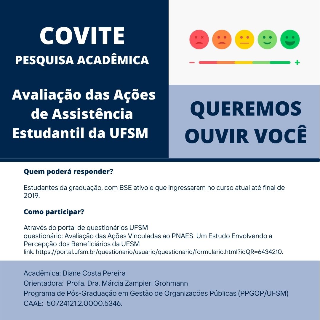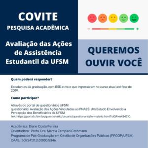 Aprovada pelo Comitê de Ética em Pesquisa com Seres Humanos (CEP), essa pesquisa intitula-se “Avaliação das ações vinculadas ao Pnaes: um estudo envolvendo a percepção dos beneficiários da UFSM”. Ela faz parte de um trabalho desenvolvido no Mestrado Profissional em Gestão de Organizações Públicas, sob a orientação da professora Márcia Zampieri Grohmann.