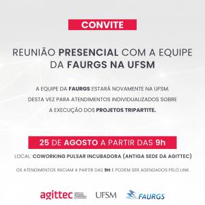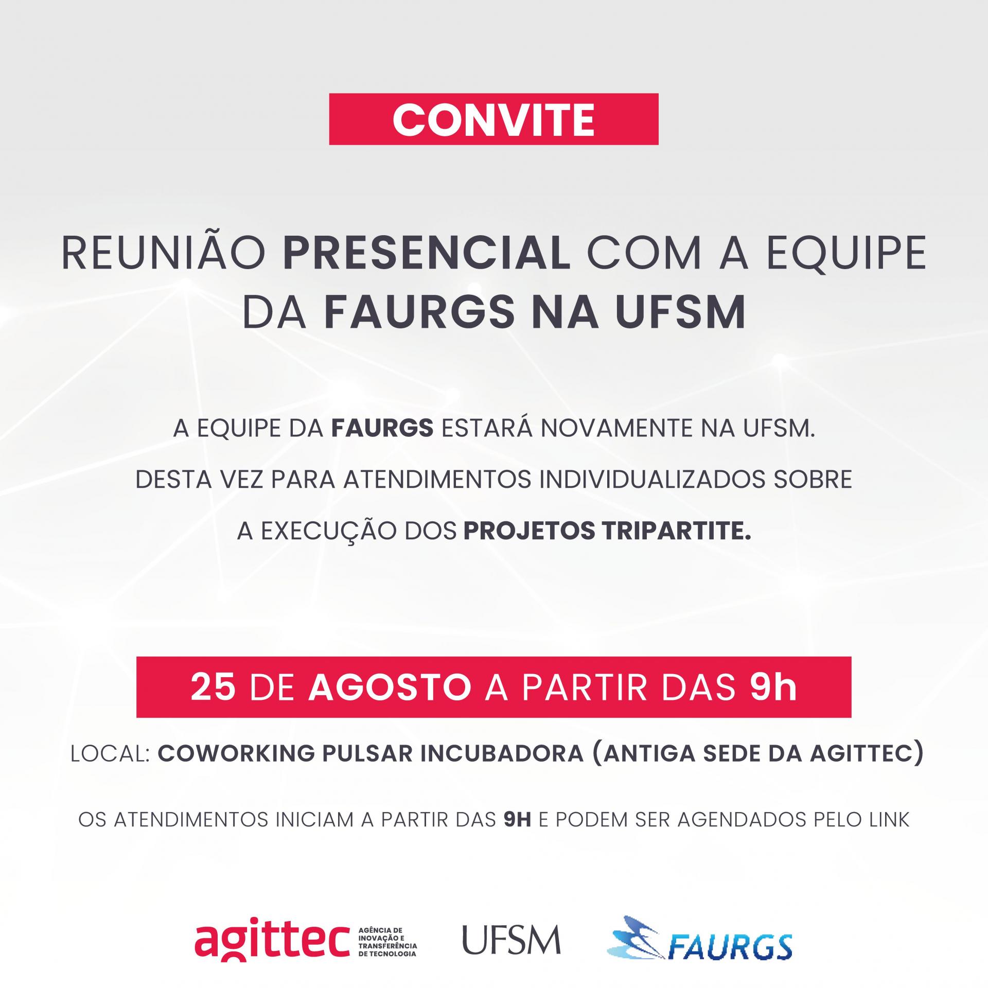 A equipe da Fundação de Apoio da Universidade Federal do Rio Grande do Sul (Faurgs) estará novamente na UFSM nesta quinta-feira (25), no espaço Coworking da Pulsar Incubadora (antiga sede da Agittec). Na ocasião, os representantes da Faurgs vão esclarecer dúvidas referentes à execução de projetos tripartite. Durante o encontro, serão realizados atendimentos individuais, visando a encontrar a melhor solução para cada caso. A reunião presencial inicia-se às 9h, porém os atendimentos começam mais cedo, às 8h. Os agendamentos devem ser realizados por meio de formulário on-line.