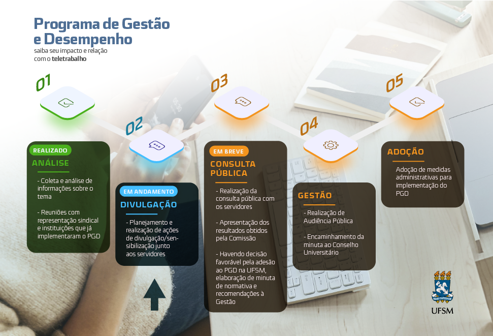 A Comissão Temporária de Avaliação e Implementação do Teletrabalho na UFSM está organizando uma série de iniciativas para debater sobre o assunto na Instituição. O objetivo é divulgar e orientar os servidores sobre o Programa de Gestão e Desempenho (PGD) e o Teletrabalho, que é uma de suas ferramentas.