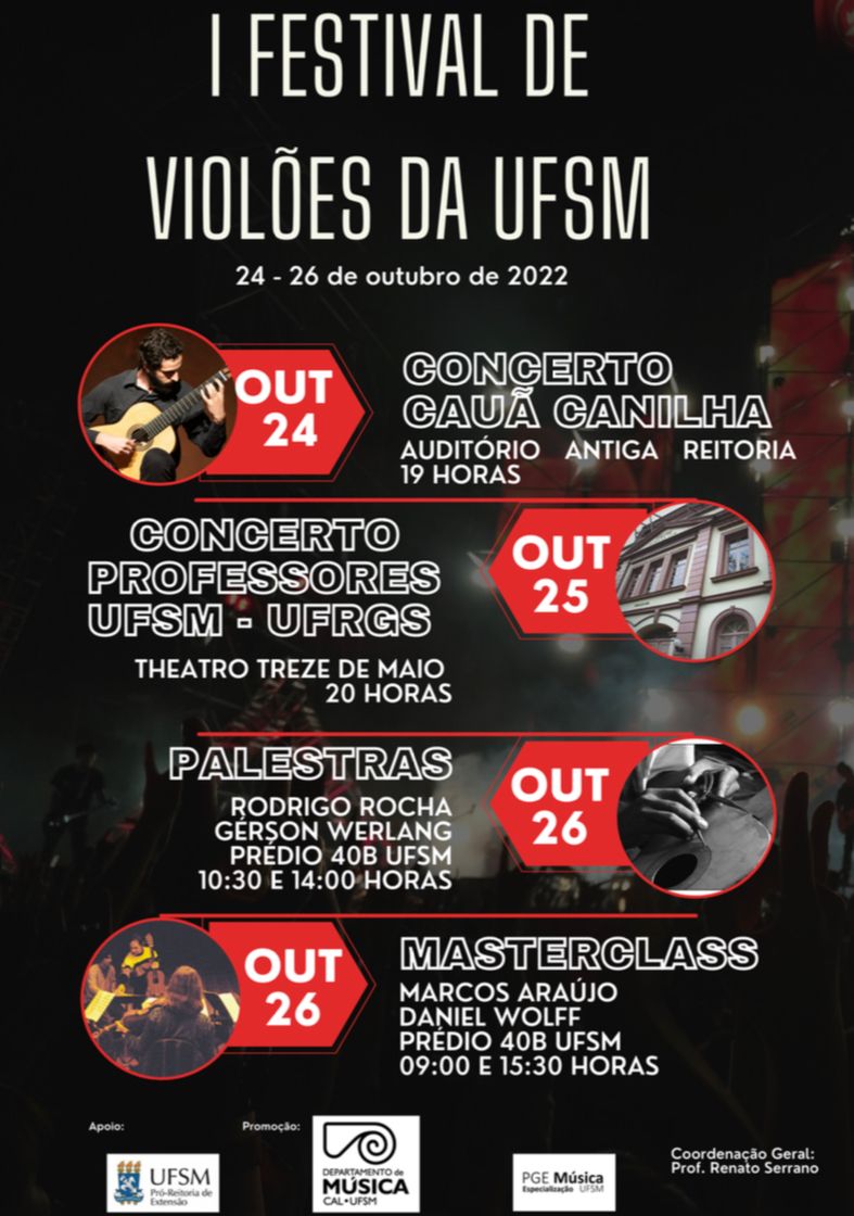 No dia 24, às 19h, no auditório da antiga Reitoria, no centro de Santa Maria, o concerto será de Cauã Canilha. No dia 25, às 20h, no Theatro Treze de Maio, concerto de professores da UFSM e da UFRGS. No dia 26, serão realizadas palestras com Rodrigo Rocha e Gérson Werlang, às 10h30 e às 14h, no prédio 40B do Campus Sede, e masterclass com Marcos Araújo e Daniel Wolff, às 9h e às 15h30, também no prédio 40B.