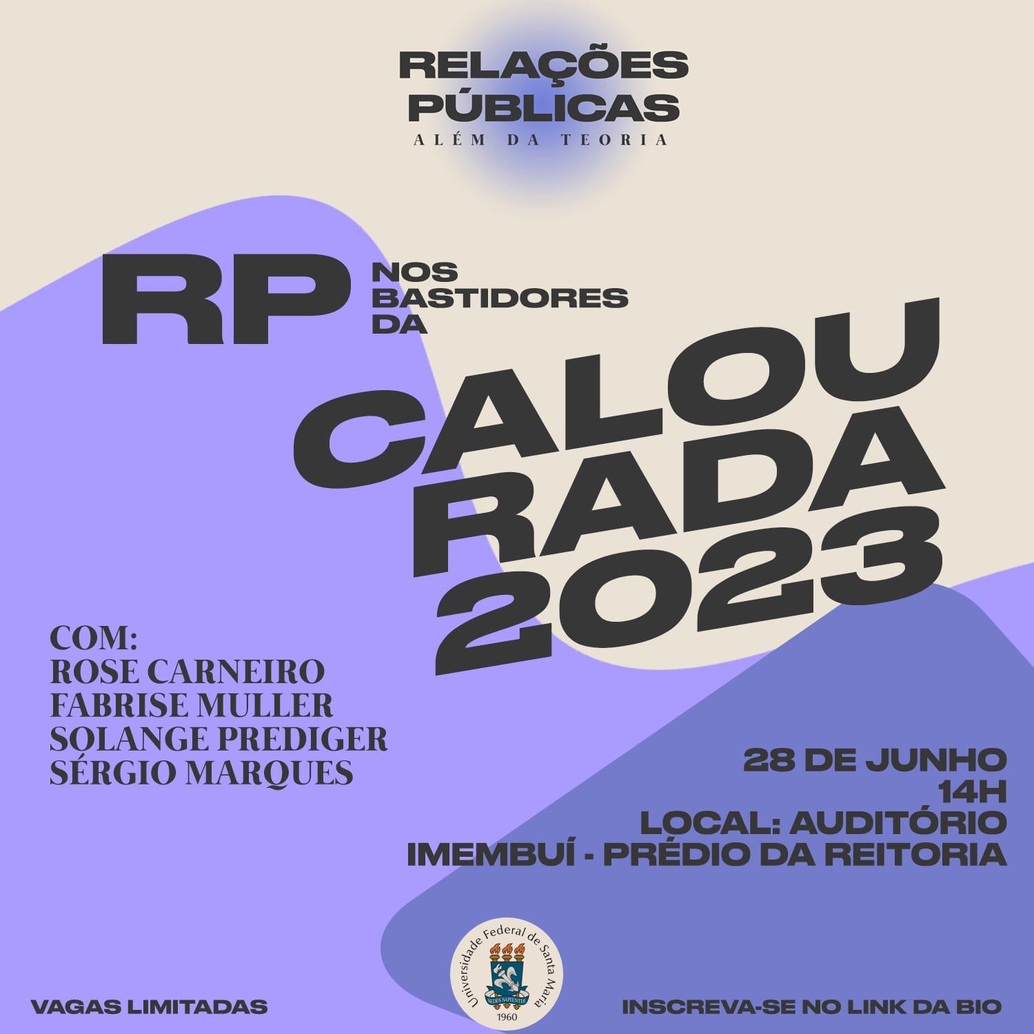 O Curso de Comunicação Social – Relações Públicas da UFSM realiza a Mesa Redonda “RP nos bastidores da Calourada”, encontro presencial que ocorre no dia 28 de junho de 2023, no Salão Imembuí – Prédio da Reitoria-UFSM, às 14h.