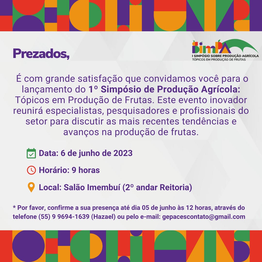O 1º Simpósio de Produção Agrícola: Tópicos em Produção de Frutas (SimPA) será realizado na terça-feira (6), às 9h, no Salão Imembuí, no 2º andar da Reitoria, numa promoção do Grupo de Estudo de Predição de Adubação e Potencial de Contaminação de Elementos no Solo (Gepaces), do Centro de Ciências Rurais (CCR) da UFSM.