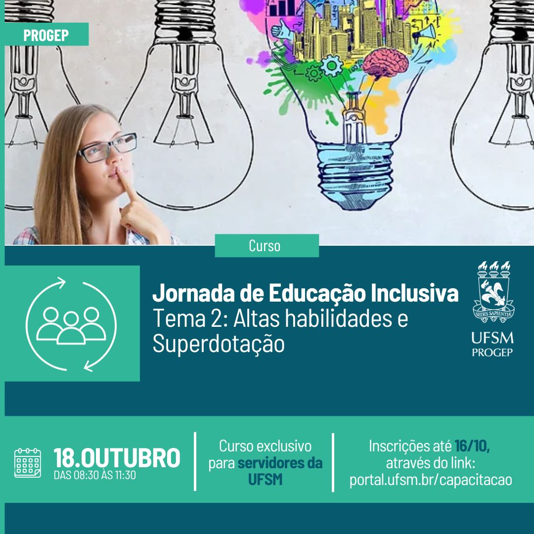 Estão abertas as inscrições para a 2ª ação de desenvolvimento da Jornada de Educação Inclusiva. O próximo tema a ser abordado será “Altas Habilidades/Superdotação”, que será conduzido pela docente Tatiane Negrini.
