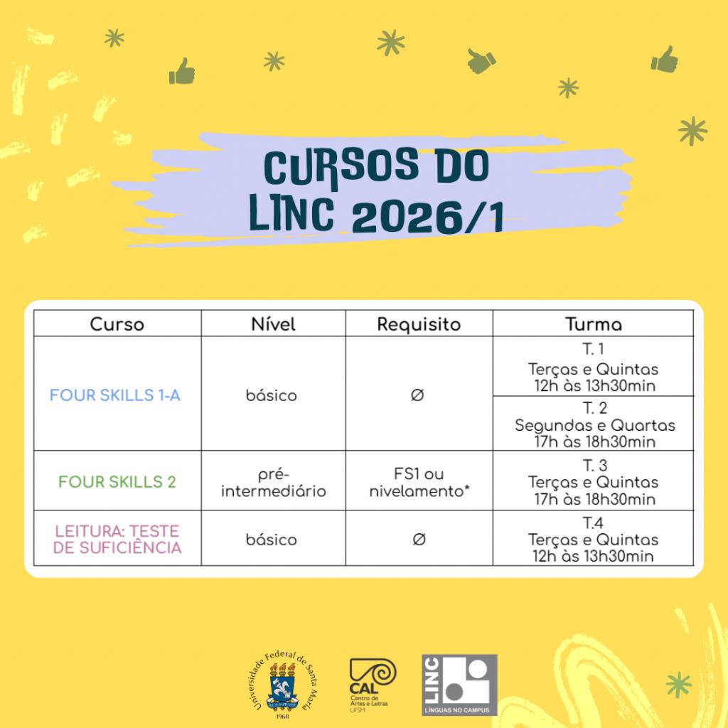 Estão abertas até a próxima quarta-feira (18) as inscrições para os cursos de inglês ofertados pelo Programa Línguas no Campus (Linc) da UFSM. São duas modalidades de curso: habilidades integradas – ler, ouvir, falar e escrever (Four Skills) – e leitura de textos acadêmicos em inglês (preparatório para o Teste de Suficiência). A modalidade Four Skills é ofertada em dois níveis (iniciante e pré-intermediário) e quem deseja ingressar diretamente no pré-intermediário (Four Skills 2) deve passar por um teste de nivelamento prévio à inscrição. As turmas disponíveis para o primeiro semestre de 2026 constam na imagem ao lado.